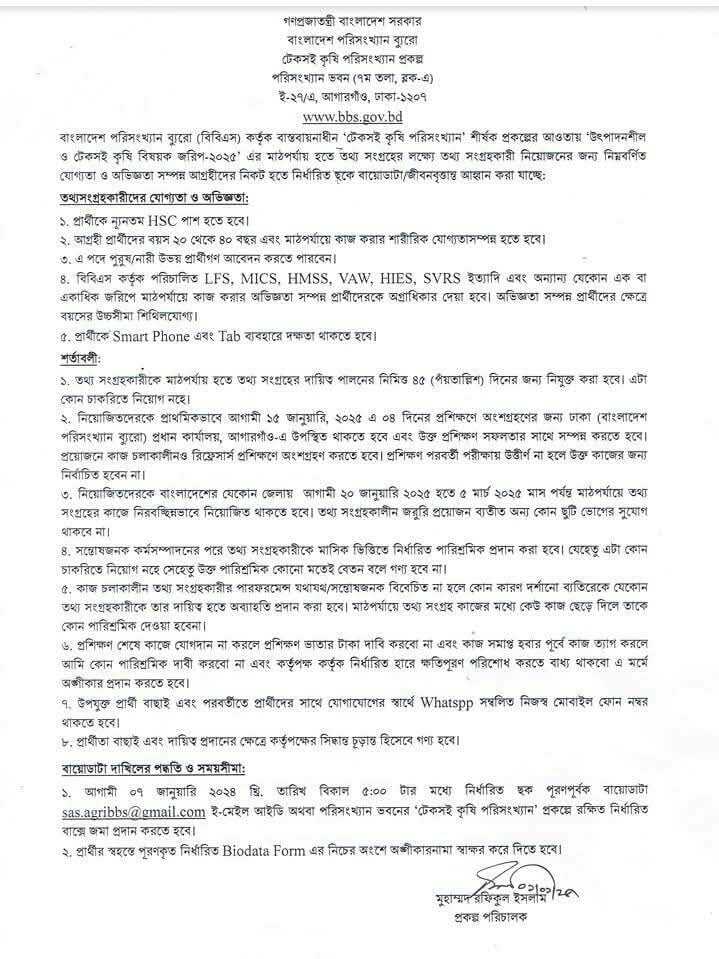 “উৎপাদনশীল ও টেকশই কৃষি বিষয়ক জরিপ ২০২৫” প্রকল্প কাজের আবেদন চলছে। নিজ জেলার বাহিরে কাজ করতে হবে। ৪৯ দিনের কাজ দৈনিক ১হাজার টাকা হারে সম্মানী দিবে।